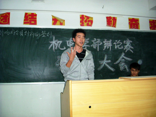 2010年10月28日晚18:00 由机械电气学部主办的“机械电气学部系部辩论赛动员大会”在1号教学楼401教室隆重举行。会场座无虚席,气氛庄严,可见在座同学对这次大会的期待。本次大会主要邀请了机电学部09级辅导员吴涛,系学生会主席团与上届辩论赛最佳辩手施展标等嘉宾。