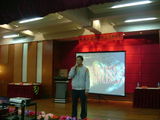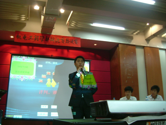 为丰富广大学生的课余生活,为同学们提供一个展现自我的平台.机电学部学生会举行了将近一个多月的系间辩论赛并成功于11月24号在图书馆三号报告厅举行了最后一场激动人心的辩论总决赛。比赛特邀08级辅导员邵翠萍老师、团总支书记吴涛、主席团成员、辩论队队长胡琦惠、院辩论队队长曾信超师兄担任评委。
