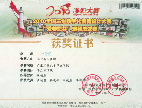 11月30日,为期4天的2010年 “全国三维数字化创新设计大赛‘爱特恩杯’现场总决赛”在江苏省常州市落下帷幕。我学部学生参赛代表队华立机炫队(参赛学生:黄达潜、杨选平、刘德康、李蔚华;指导老师:屈福康老师) 获得一等奖和二等奖各一项。