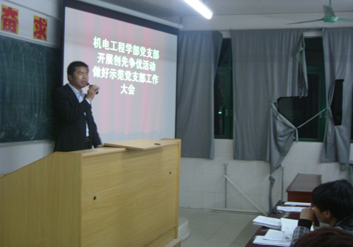 3月7日晚上19:00分机电工程学部党支部在1号教学楼401召开以“开展创先争优活动 做好支部示范工作”为主题的支部会议。出席本次会议的有学部党支部郭堪通书记以及学部所有学生党员。