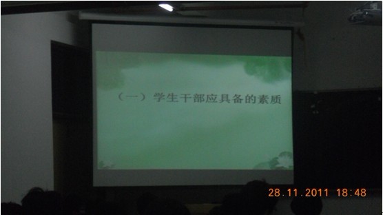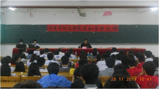 2011年11月28号,机电工程学部学生会第二期干事培训在3号楼108举行。由主持人介绍培训的目的,然后播放团歌,之后就由吴涛老师为我们机电工程学部学生会的干事干部门上培训课。