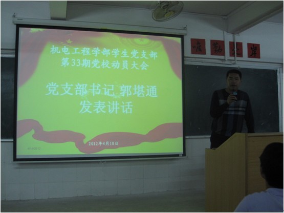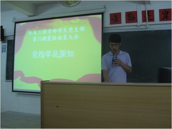 为了让入党积极分子正确认识党校学习的重要性和让入党积极分子明白上党校时应该注意的事项,我学部机电工程学部党支部在2012年4月18日(星期三)晚上7点到晚上7点30分在1号楼404课室组织入党积极分子开展第33期党校动员大会。机电工程学部的入党积极分子准时到场,聆听了郭书记的讲话和机电工程学部党务秘书梁秋贵的讲话。
