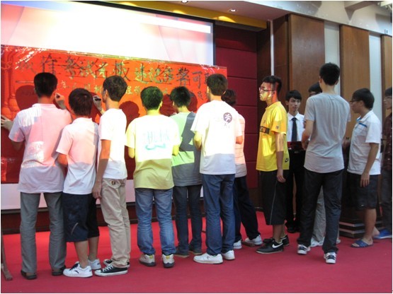 各班班长在签名板上签名