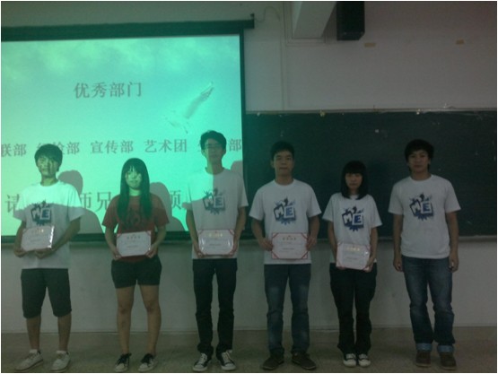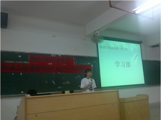 会议一开始,全体起立,唱团歌,之后播放电子相册,回顾学生会一年来的工作成果,并由包杰老师总结发言,然后各部门总结发言。