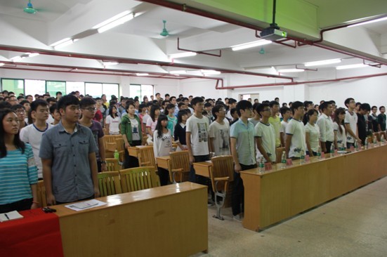 大会的流程主要分为七项进行:首先,全体起立,奏团歌;第二项,由团总支书记唐艳凤老师发言,她相信干事们会将学生会越办越好。同时,老师言简意赅的发言燃烧了新干事们心中的热情;下面几项分别由主席刘畅师兄、团副书记吴伟杰师兄、部长代表、干事代表发言,他们表达了对新干事的热烈欢迎和衷心的祝贺,还有对未来工作的期望;最后一项由党支部郭堪通书记致闭幕词,他相信新干事们能够共创辉煌,为机电与信息工程学部争光,为学院争光。
