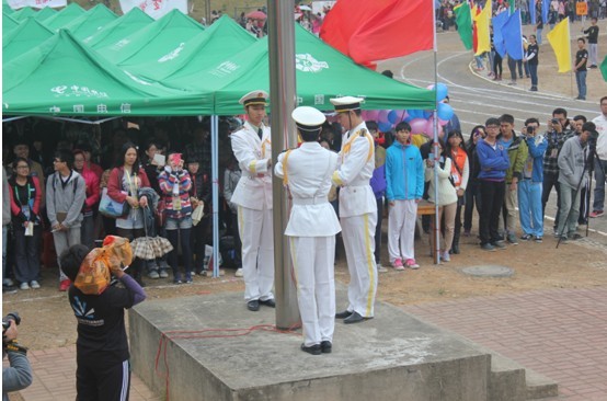 随着进行曲的响起,运动员、裁判员进场,他们踏着矫健的步伐先后经过主席台,彩旗与他们灿烂的笑脸交相辉映。后面是由团委,社联,记者团,学生会四大组织以及各个专业等的代表方阵,迈着整齐的步伐经过主席台,接受检阅,接着国旗声响起,伴着庄严肃穆的旋律,五星红旗在全场的师生注目下冉冉升起。