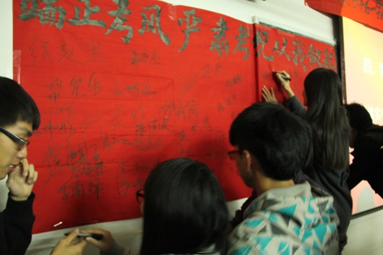 会上,团总书记唐艳凤老师详细地宣读有关《广东工业大学华立学院关于授予学士学位实施办法》并讲述了各种有关学士学位证的知识。之后由学生代表林肯肯同学宣读《诚信考试倡议书》 。最后党总支书记郭堪通书记向同学们仔细的讲述了考试中遇到的一些问题,并且讲解了一些学校对考试作弊行为的认定和处理办法,告诉同学们应该树立诚信意识,形成良好的学风和考试纪律,认清考试舞弊行为的危害性和不可弥补的严重后果。并重点讲述了学生手册上的考试违纪处分的处罚细则,嘱咐同学们回去一定要认真看学生手册上的考试作弊受处分的内容。同时也类举了一些考生作弊将会受到严重处分的例子,让大家引以为戒,希望同学们能够自觉地诚心对待考试,发扬诚信考试的考风。在大会的最后学生会各干部以及各班班长在宣传板上签名以表决心。大会圆满结束。