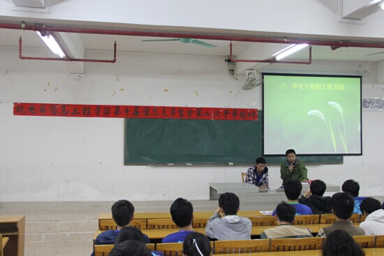 机电与信息工程学部的第二次干事培训大会于2014年11月12日下午在3号楼209隆重举行,本次大会是继上次之后,旨在进一步提高所有干事的能力素质而举办。出席本次会议的有郭堪通书记,7位机电主席团成员,以及各部门的干事及部长。
