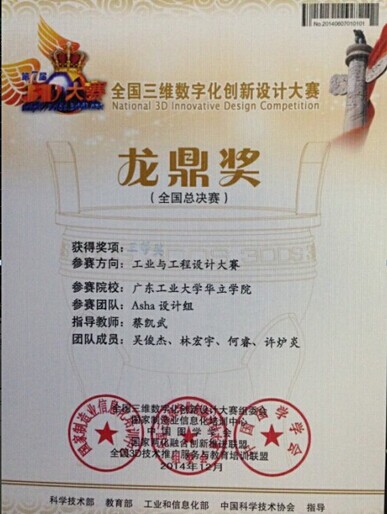 12月4日至7日,第七届全国三维数字化创新设计大赛总决赛在江苏常州落幕。在蔡凯武老师的精心指导下,我学部学生吴俊杰、林宏宇、何睿、许炉炎组成的代表队的现场作品“Asha设计组”获得工业与工程设计大赛三等奖。这也是继2010年、2011年、2012年、2013年之后连续第五年获奖。