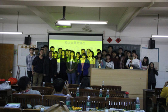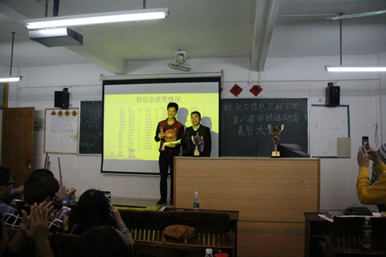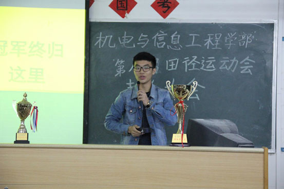 在2015年12月3日晚上,机电与信息工程学部举办了一个校运会表彰大会,本次表彰大会邀请了学部的郭堪通书记出席,本次会议的主要内容是表彰那一些在校运会上面为机电学部争光的运动健儿们,同时也是庆祝机电与信息工程学部在本次校运会上面获得了团体第一的傲人成绩。