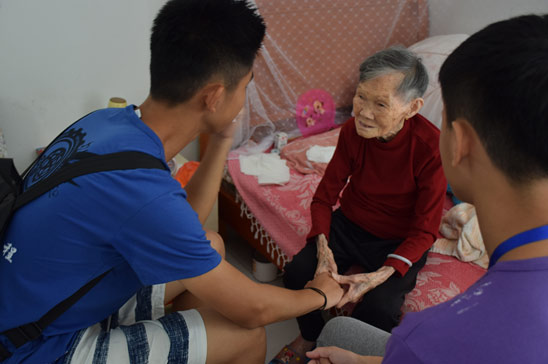 活动开展过程中,志愿者们为老人剪指甲,陪老人们散步,愉快地与他们交谈,聆听他们生活的点点滴滴,直至他们丰富的人生阅历。