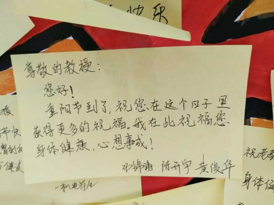 在重阳节前夕,机电学生会在一饭水池旁设置了摊位,向全院的学子征收了对老教授的祝福语,在同学们热情的支持和配合下,活动进行得如火如荼。最后用一条条暖心的祝福编织成爱心的海洋,充分体现了我校的人文精神。