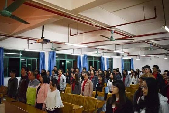 本次会议在庄严的国歌中拉开了序幕,全体人员面对着国旗唱响国歌,音乐声停止后,会计学部学生党支部书记高志煌上台进行发言,高志煌书记表扬了机电和会计两个学部全体党员的美好风貌,表示本次外出所获得的启发,能给全体外出学习的学员们未来的学习和生活中带来许多帮助。