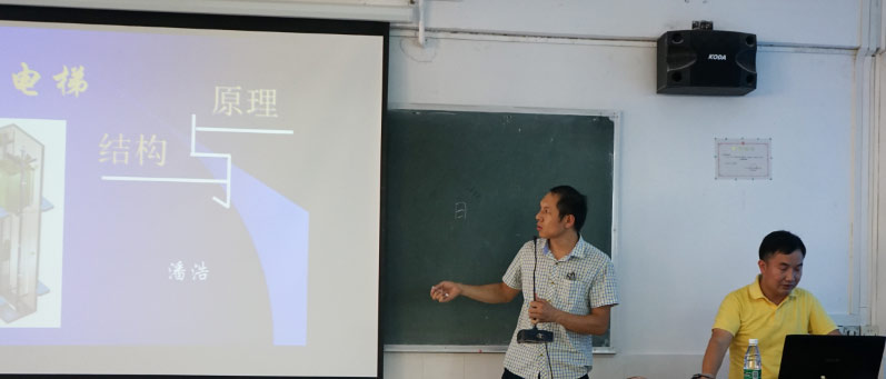 潘教授主要为同学们讲解电梯的结构及其原理。首先,他向同学们介绍了电梯的发展,由此引发出对电梯基础知识的讲解。其中包括电梯分类,电梯规格型号等。同学们对电梯里蕴含的知识十分感兴趣,听得格外认真。
