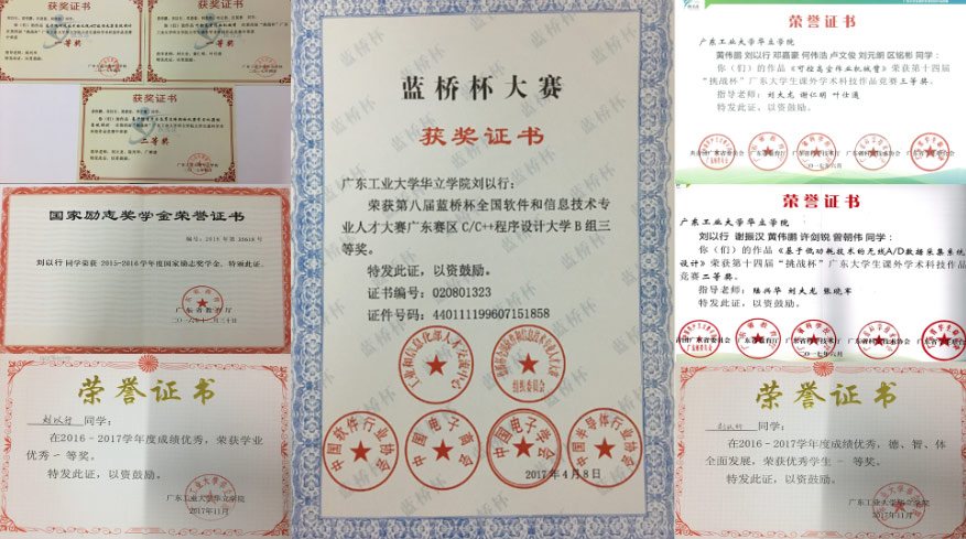 学习上,于大二期间参与主持广东省“攀登计划”《仿生直立双足机器人》等重大项目三项,《基于嵌入式的多自由度机器人关节的研发》等大创项目两项,并于同年发表学术论文一篇;大三期间以第一作者单位发表学术论文两篇,荣获国家励志奖学金,广东省第八届蓝桥杯大赛省三等奖,第十四届“挑战杯”广东大学生课外学术科技作品竞赛省二、三等奖,广东省大创项目优秀结题等国家级和省级奖项;获得多项广东省攀登计划项目立项。