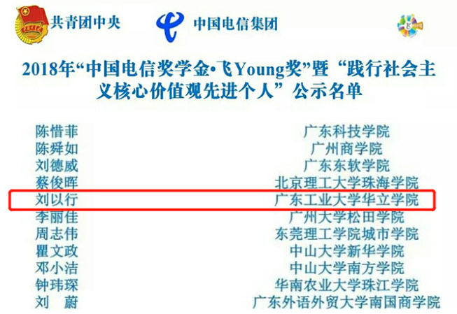 为深入发掘青年学生践行社会主义核心价值观的优秀典型,并发挥示范引领作用,带动广大青年学生在社会主义核心价值观指引下,勤奋学习、砥砺品格、全面发展,为实现中国梦不懈奋斗,共青团中央、中国电信集团公司、全国学联组织开展了2018年“中国电信奖学金”暨“践行社会主义核心价值观先进个人”遴选寻访活动,面向全国高校遴选50名“中国电信奖学金·天翼奖”暨“践行社会主义核心价值观先进个人标兵”及1700名“中国电信奖学金·飞Young奖”暨“践行社会主义核心价值观先进个人”。