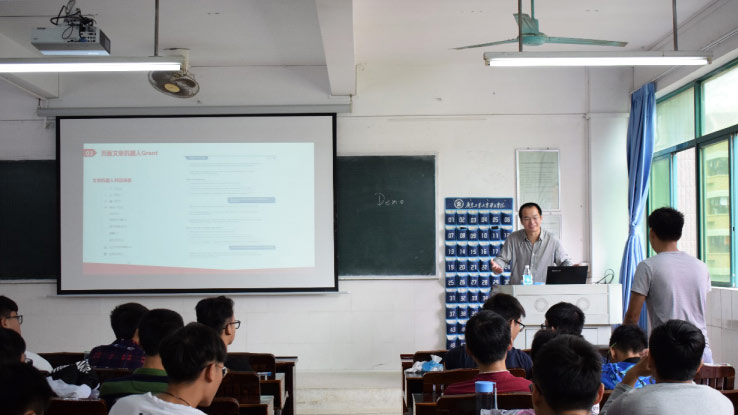 首先,主讲人兰海英老师先做了一段自我介绍,并逐步向同学们讲解智能交互的用户体验设计方法及虚拟客服场景实行案例。在场的同学们对机器人智能交互的知识十分感兴趣,听得格外认真。