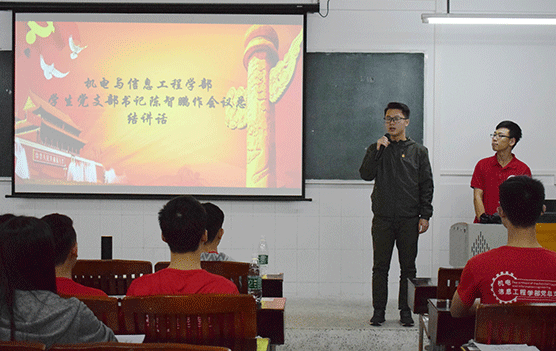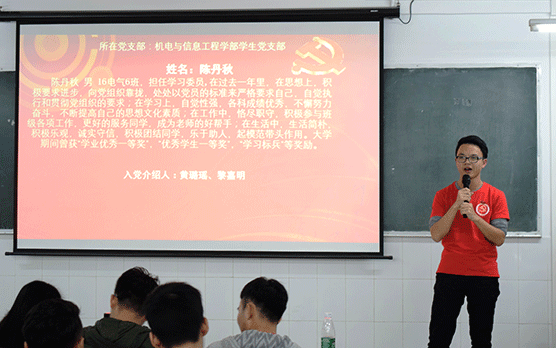 2018年12月20日,机电与信息工程学部党总支在一号教学楼406召开2018年下半年预备党员转正大会,出席本次大会的嘉宾有机电与信息工程学部学生党支部书记陈智鹏,18级辅导员罗文雯老师,张涵老师及在校学生党员和党务秘书。