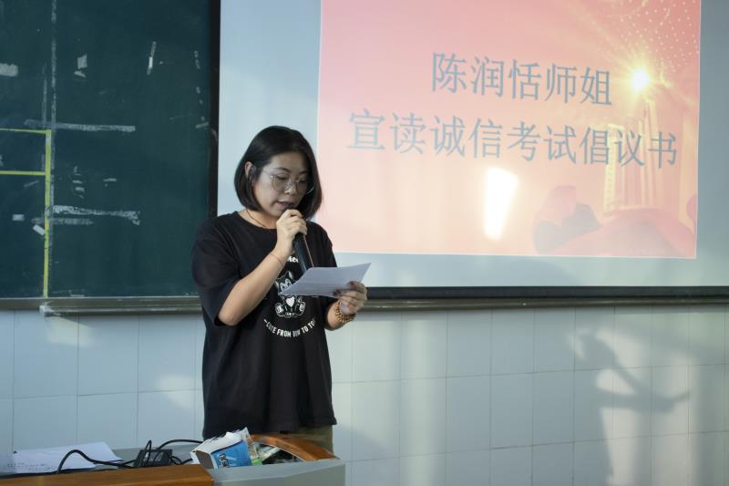 接着进行大会第三项内容,由陈润恬师姐宣读诚信考试倡议书,倡议同学们诚信考试,不做考场违纪之事。