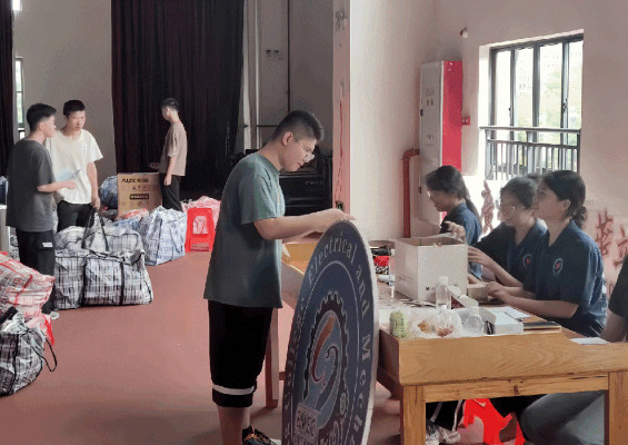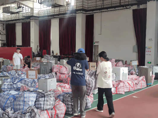 江门校区回来的学生在文体楼认领行李和领取物资