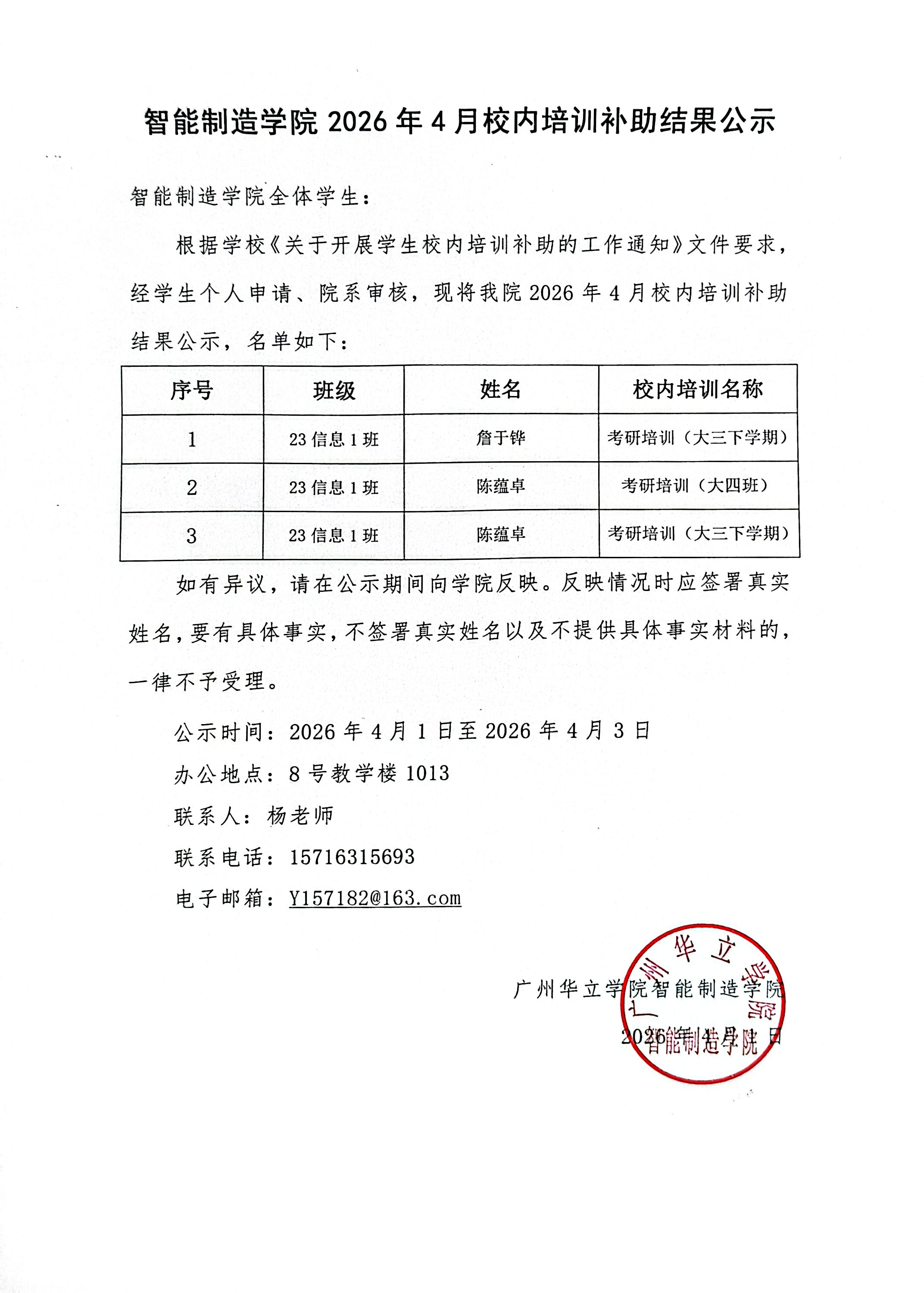 智能制造学院2026年4月校内培训补助结果公示