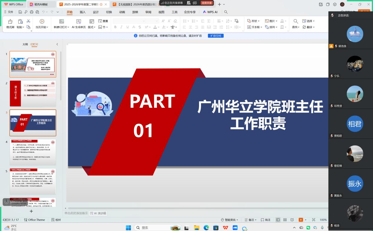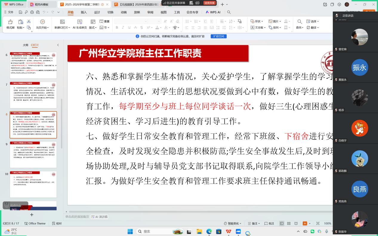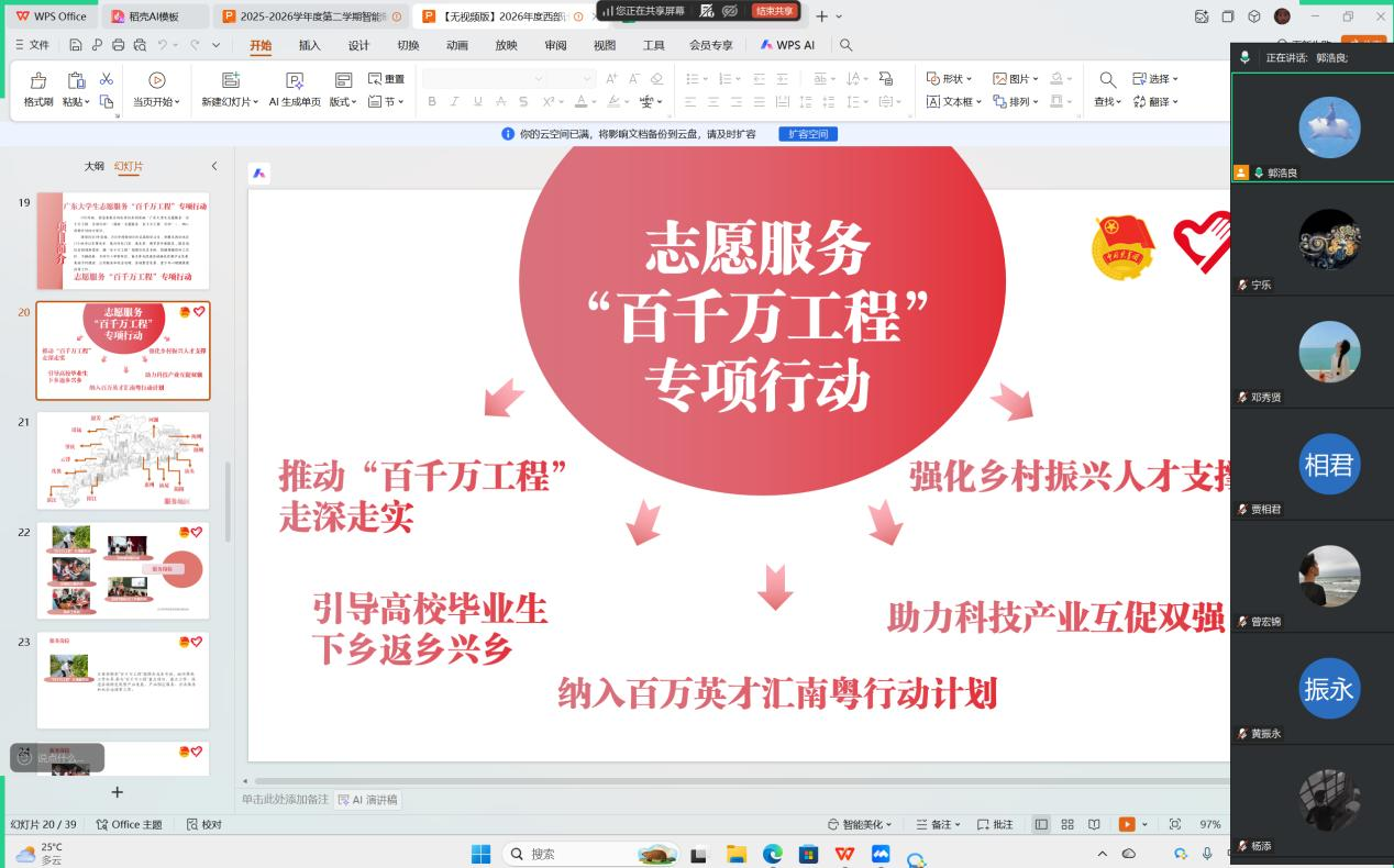 在会议上,郭老师围绕毕业班核心工作开展专题讲解,内容兼具针对性与实用性,其中重点增加了大学生西部计划专题宣讲培训。培训详细解读了西部计划的招募条件、服务岗位、服务期限、补贴标准、升学就业优惠政策等核心内容,明确了班主任在宣讲工作中的职责的分工,要求班主任结合班级学生专业特点和就业意向,开展精准宣讲,主动解答学生疑问,做好报名指导和跟踪服务,引导学生树立正确的就业观、成才观,积极响应国家号召。