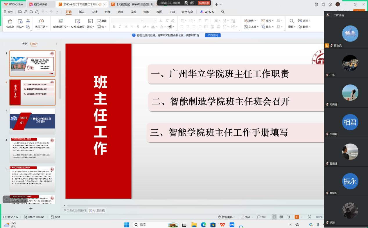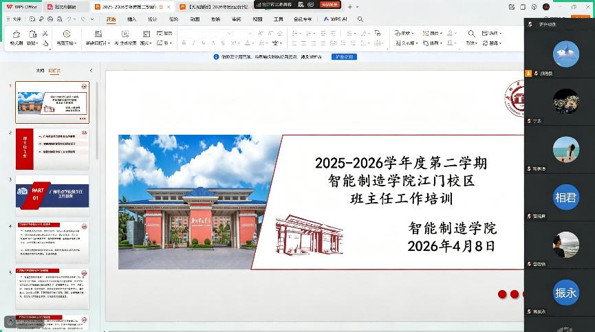赋能履职守初心精准护航促成长——智能制造学院举办毕业班班主任管理工作培训会议为深入落实立德树人根本任务,进一步强化毕业班班主任队伍建设,提升班主任履职能力,明确毕业季各项工作重点,规范工作流程,切实做好毕业生思想引导、就业帮扶、实习管理及安全保障等工作。2026年4月8日,智能制造学院举办毕业班班主任管理工作培训会议。会议伊始,会议主讲人郭浩良老师充分肯定了全体毕业班班主任在学生成长成才过程中付出的辛勤努力,并结合当前毕业班工作新形势、新特点,对班主任工作提出明确要求,重点强调了大学生西部计划宣讲推广工作的重要性。
