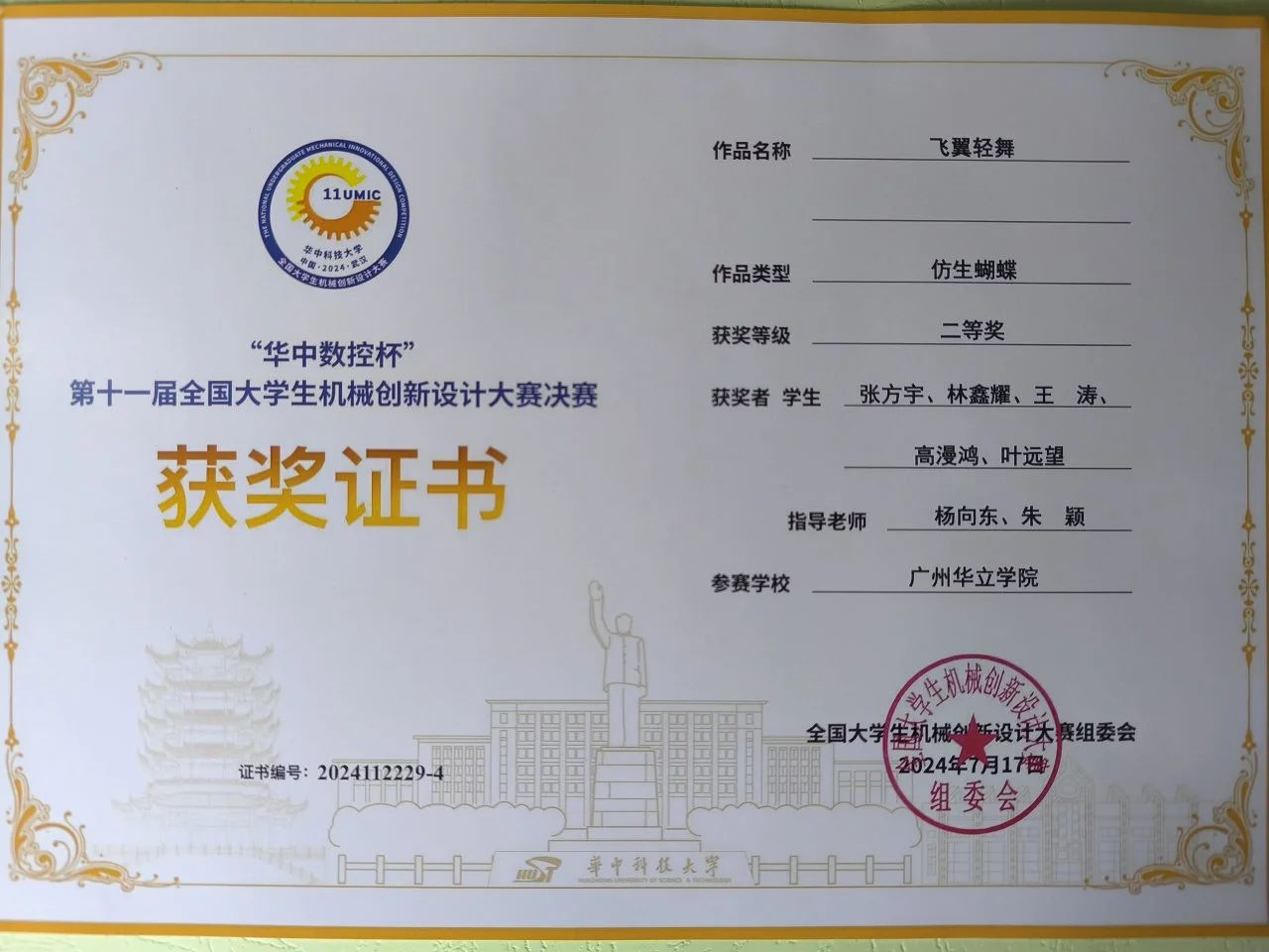 2024年7月15至18日,在指导老师杨向东和朱颖的带领下,机电工程学院张方宇、林鑫耀、高漫鸿、王涛和叶远望等同学的参赛作品《飞翼轻舞》,以赛道广东省最高分勇夺A2类全国大学生机械创新设计大赛(11届)国赛银奖,创造了我校同类赛事近六年来的历史最佳成绩。