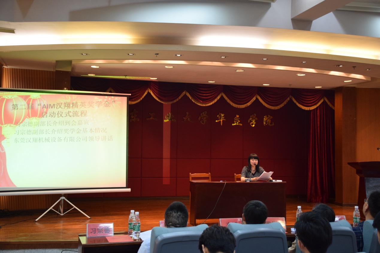 4月6日下午2:00,机电与信息工程学部于图书馆二号报告厅举行第二届“AIM汉翔精英奖学金”启动仪式。出席本次会议的嘉宾分别为:温孝胜院长、郭松平院长、王学军学院、东莞汉翔机械设备有限公司曾嘉副总经理,杨铭然副总经理、王明信副总经理、校外办处长李斌、学生处处长李玉林、机电学部部长黄华养和机电学部副部长习宗德等相关领导。