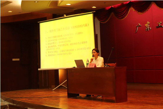 大会第二项,校外教学副主任卢清秀为同学们讲解实习注意事项。大四的就业实习是以学习为主,赚钱为辅,其次她强调在实习期间,安全是首要目标,要在保障安全的前提下进行实习。