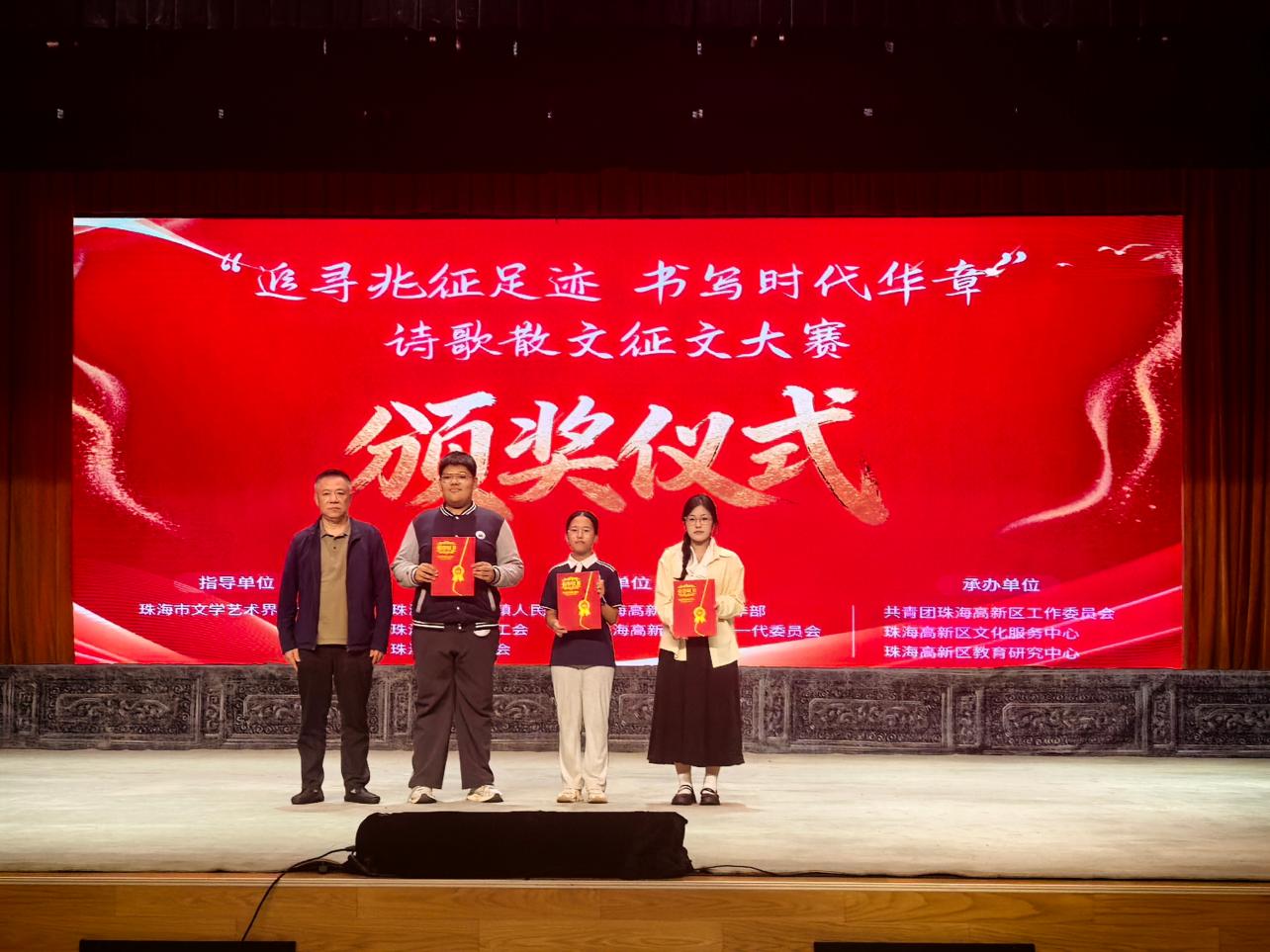 近日,由珠海市唐家湾镇人民政府、珠海高新区党群工作部等单位主办,共青团珠海高新区工作委员会等承办的“追寻兆征足迹 书写时代华章”诗歌散文征文大赛圆满落幕。我院2024级学子黄婷瑜凭借散文作品《海的刻度》脱颖而出,荣获散文类—大学组一等奖,隋丽丽老师获评“优秀指导老师”。