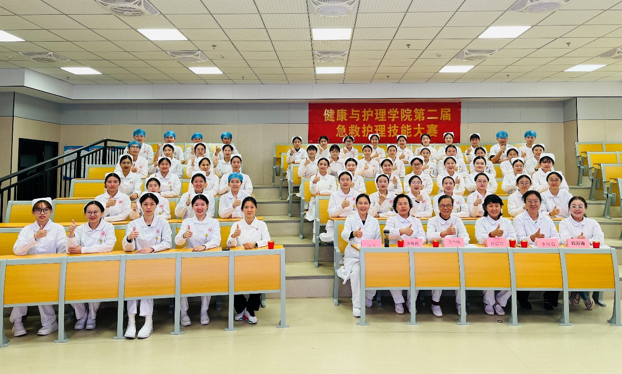 比赛结束,全体评委、教师与获奖选手合影留念,第二届学生急救技能大赛圆满落幕。未来,健康与护理学院将持续打造“救在身边”系列品牌赛事,为培养理论扎实、技能过硬、德智体美劳全面发展的高素质护理人才注入不竭动力。