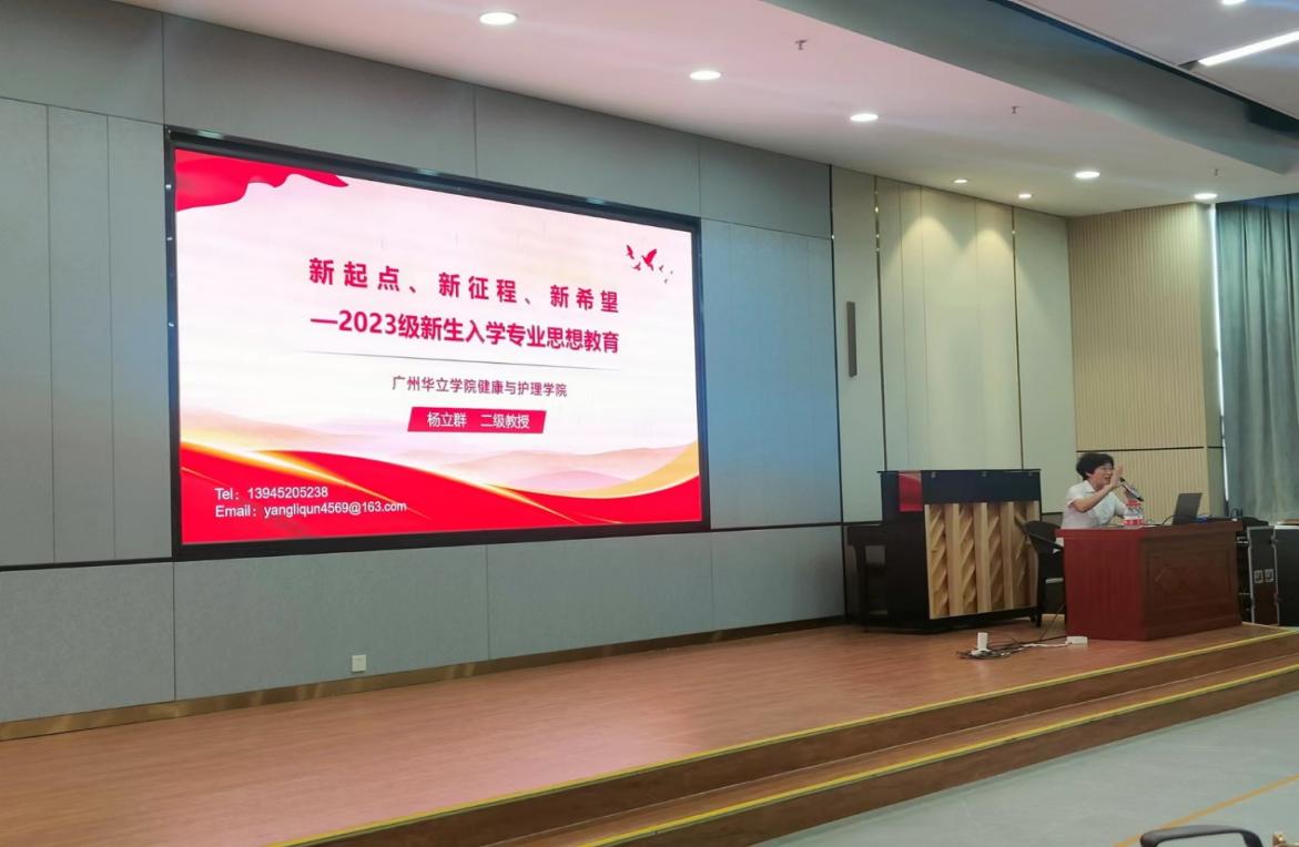 为帮助新生全面了解学校和专业,尽快适应大学生活,树立远大理想,9月7日,我院在图书馆一号报告厅举办了2023级新生入学教育,广州华立学院江门校区教务处副处长耿爱农、健康与护理学院院长杨立群教授、副院长隋树杰教授、系主任郭丽梅副教授、班主任杨琪、古淑辉、夏炎艳、高达程、刘丽云、张晓波、教务老师李皑、辅导员宋夏彤以及2023级全体新生参加了此次讲座。张晓波老师主持此次讲座。
