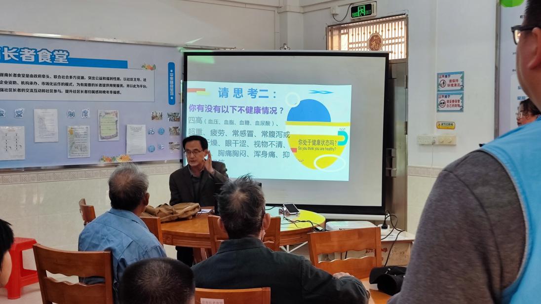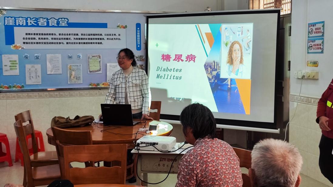 接着,郭丽梅副教授为老人重点讲解了糖尿病的相关信息以及如何预防糖尿病。生活中我们可以劝诫身边的老年人控制碳水化合物摄入,增加蔬菜水果摄入,合理摄入蛋白质,对油脂类食物尽量做到不吃就不吃,同时还要保证每天有一定的运动量。