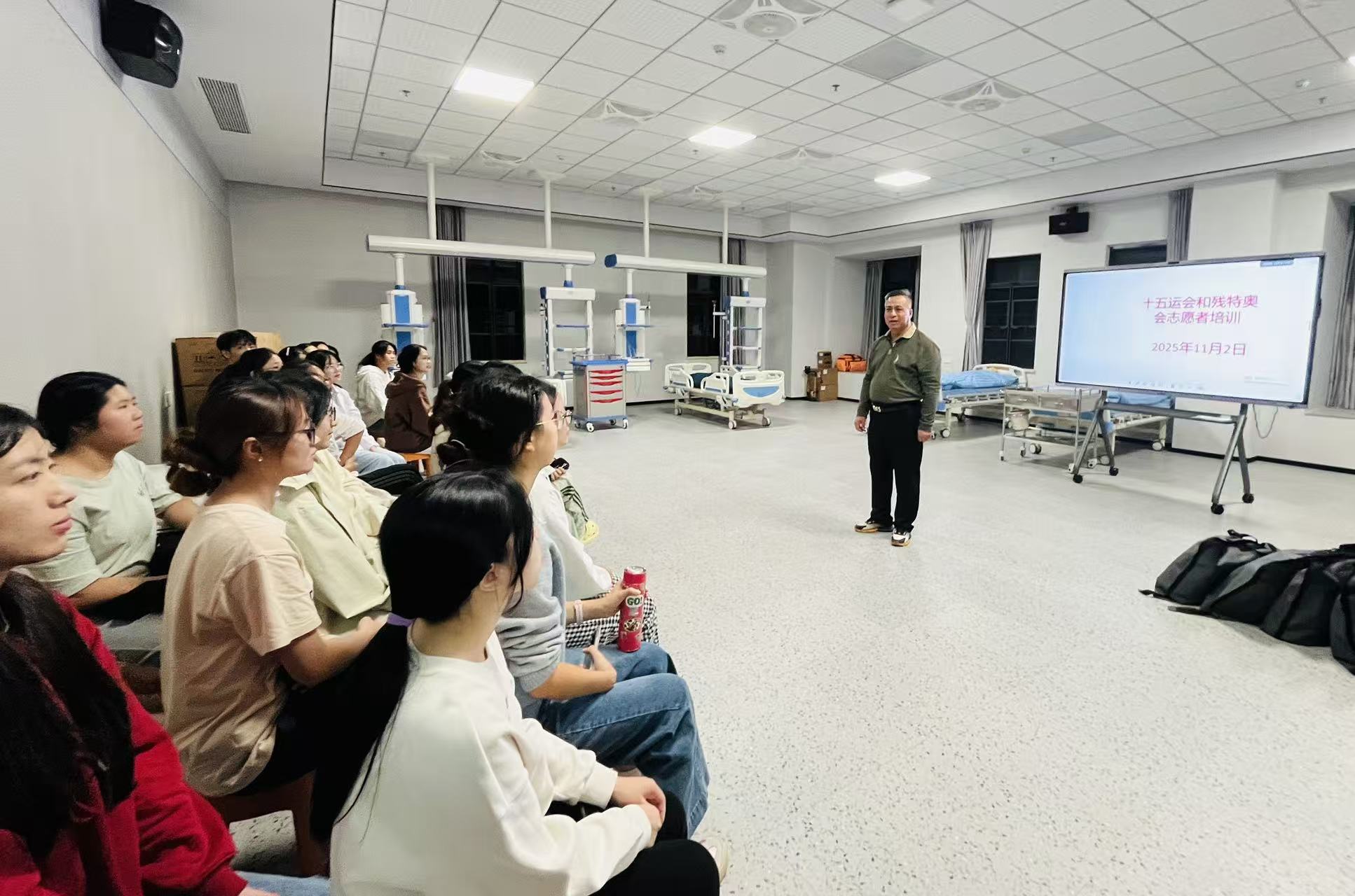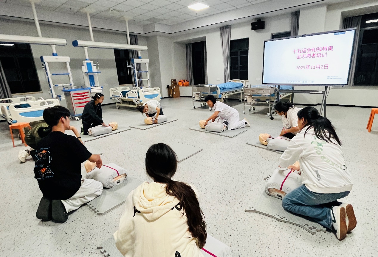 2025年11月3日晚,华立学院(江门校区)医学实验室灯火通明,哨声此起彼伏——第十五届全国运动会和残特奥会志愿者应急救护专场培训在此举行。来自健康与护理学院的70余名赛会志愿者利用晚间课余时间,分批完成“院外心肺复苏+止血包扎”两大模块的实战训练,为赛场志愿服务蓄力储能。外科教研室教师赵军、孙建玲、李凤菊、董杰等教师团队,实验中心许俊艳主任亲临指导。