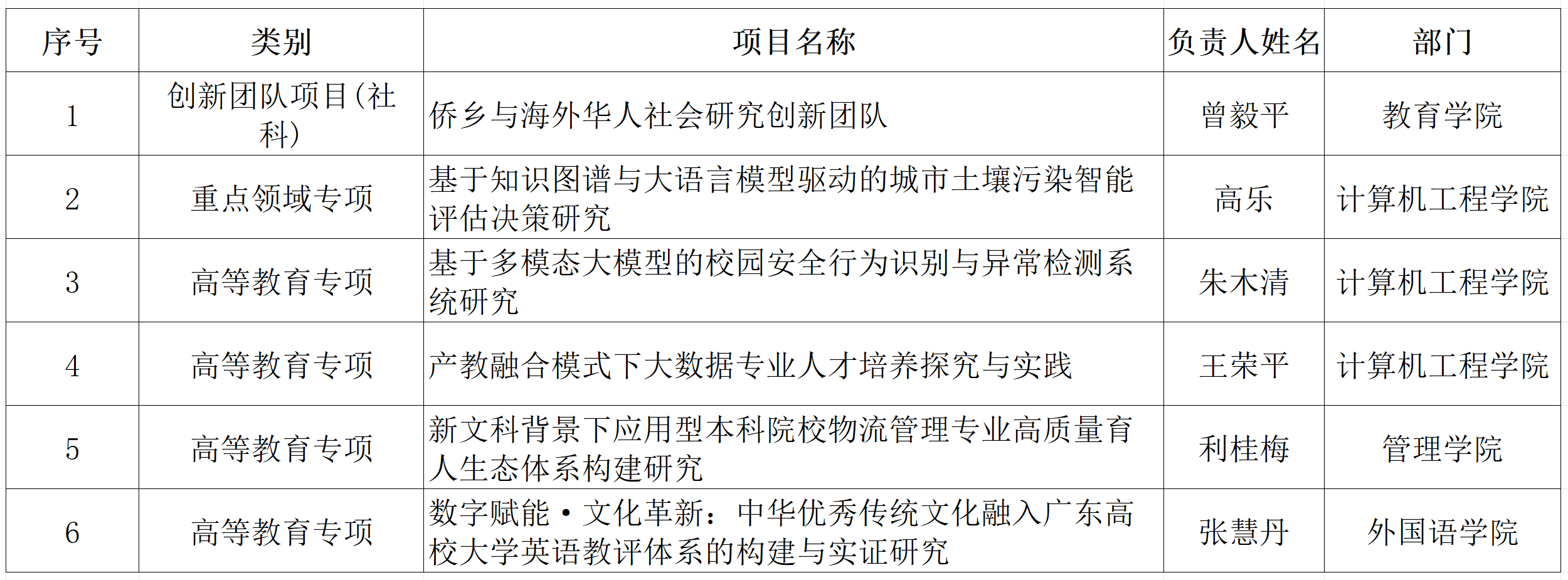 近日,广东省教育厅公示了2024年度广东省教育厅科研平台和项目及省教育科学规划课题(高等教育专项)评审结果。我校共获批6项,其中创新团队项目(社科)1项、新一代电子信息(半导体)重点领域1项和高等教育专项4项。