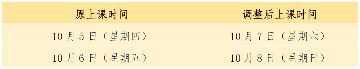2023年9月28日(星期四)至10月6日(星期五)放假调休,共9天。10月7日(星期六)、10月8日(星期日)上班。有关课程调整如下: