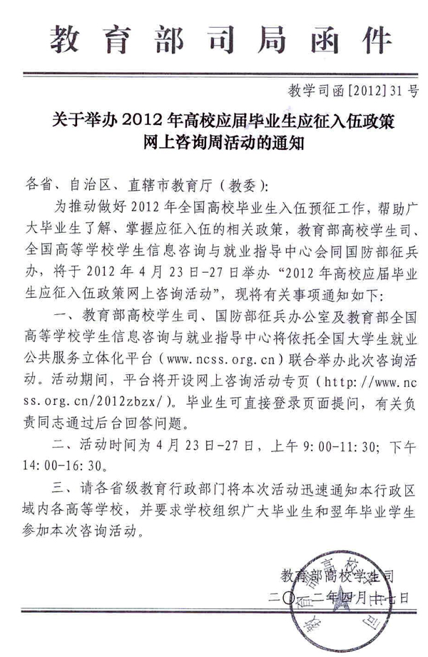 转发教育部高校学生关于举办2012年高校应届毕业生应征入伍政策网上咨询周活动的通知 作者:就业办 发布时间:2012-04-26 00:00:00 浏览次数: 次 【字体:小 大】 分享到: 【打印正文】