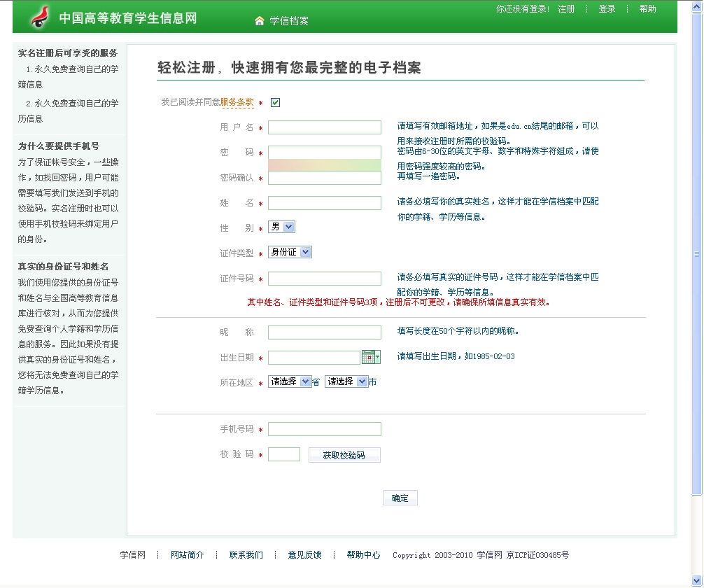 ②填写姓名时不能出现错别字,与学籍信息中的姓名不匹配时虽能注册成功但无法查询到学籍信息;