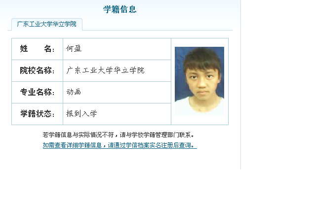 1.查询方法:登录 “全国普通高校新生学籍查询系统”( http://xjxl.chsi.com.cn/index.action),输入考生号、身份证号、姓名三项中至少两项及校验码(如图1),可查询本人的学籍信息,包含姓名、院校名称、专业名称、学籍状态(如图2)。