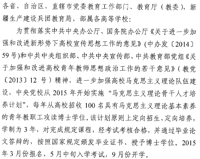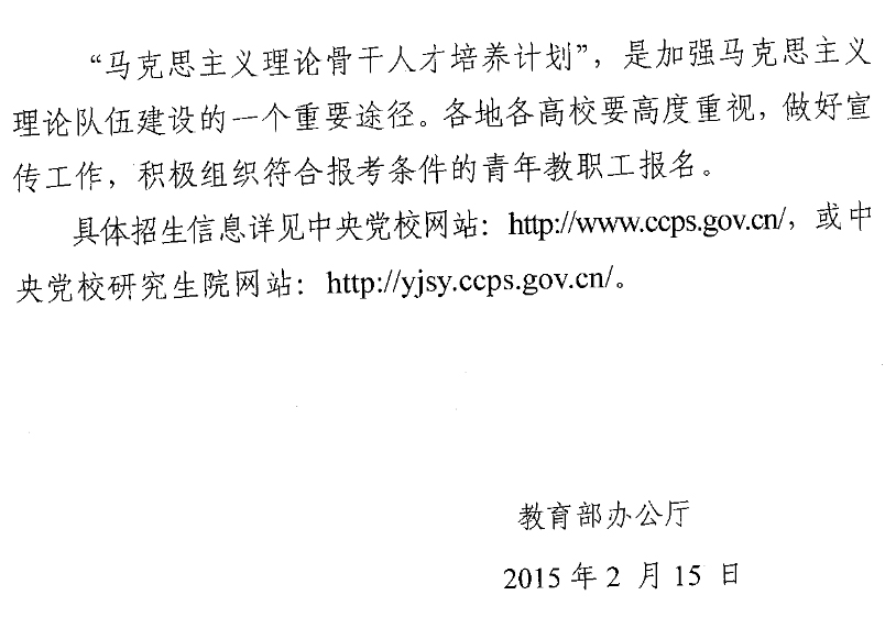 转教育部办公厅关于配合做好中央党校“马克思主义理论骨干人才培养计划”招生工作的通知 作者:学院办公室 发布时间:2015-03-16 00:00:00 浏览次数: 次 【字体:小 大】 分享到: 【打印正文】