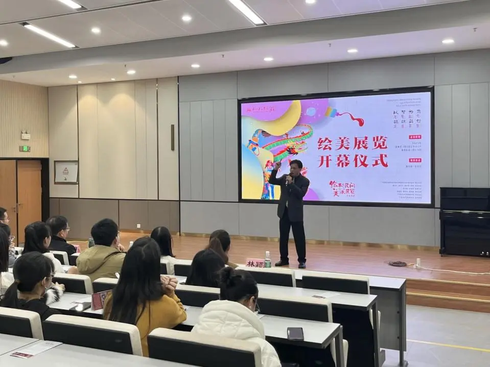 开幕式上,粤港澳大湾区美术家联盟副主席、江门市美术家协会主席、新会区美术协会会长林瑞华结合江门地域背景,围绕绘本及民间美术的创作构思及文化思想进行总结和畅想。