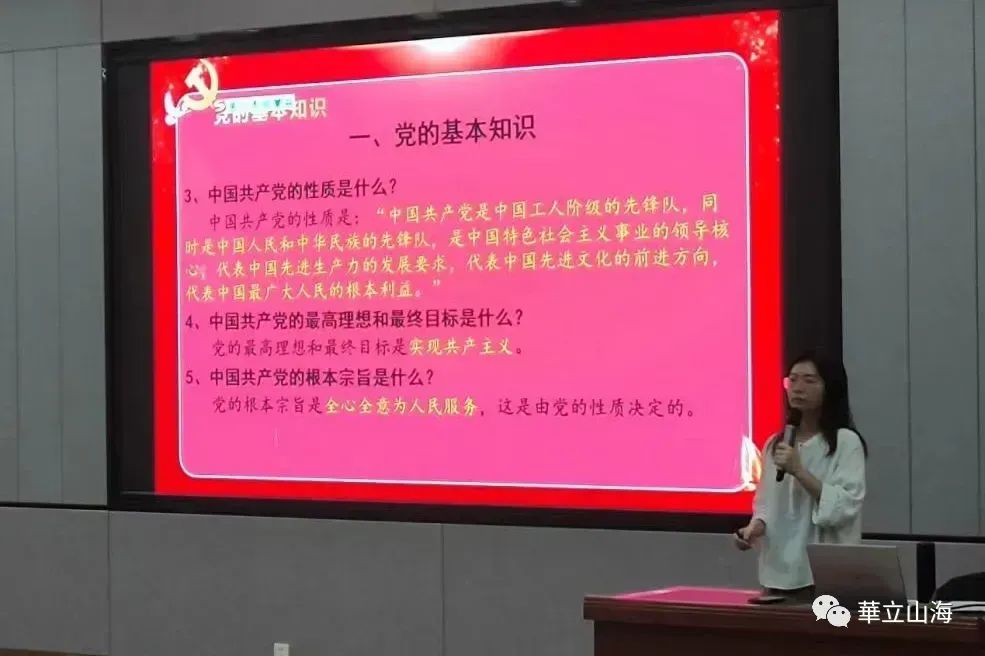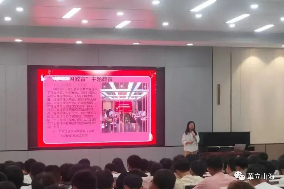 主讲老师以广州华立学院内的党史学习教育为例,重点讲述了学习教育的目标要求、突出任务、起止时间以及指导思想。以及未来江门校区将建设党史文化学习长廊,帮助我校师生更深入地了解中国共产党的历史、党的奋斗历程和党的伟大事迹。也有助于学生在党史中汲取智慧,培养对国家和社会的责任感,促使他们更加自觉地践行社会主义核心价值观。