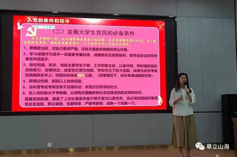最后,为让同学们更加了解入党的基本流程,主讲老师从申请入党、入党积极分子的确定和培养教育、发展对象的确定和考察、预备党员的接收、预备党员的教育考察和转正五大流程详细的为同学们展开介绍。