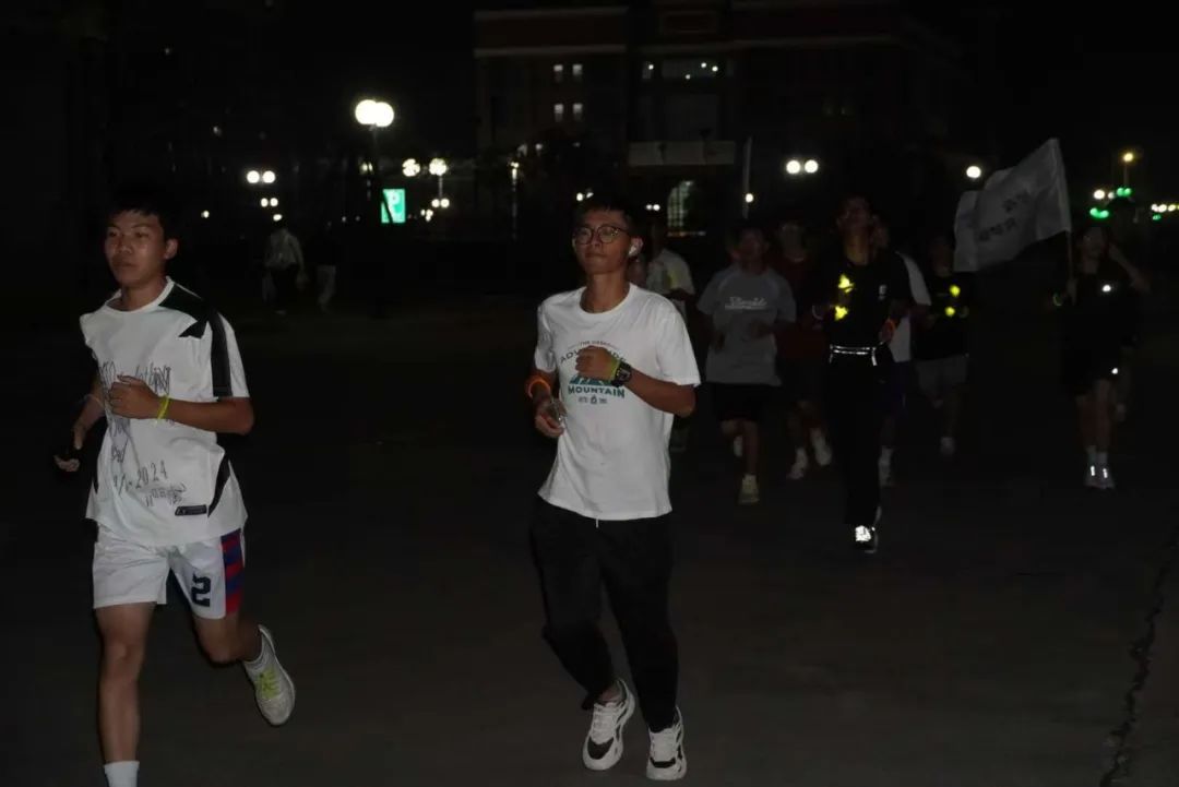 夜幕降临,同学们分成6个队伍,每个队伍都有一名旗手带领。在综合楼广场集合后,大家开始了三公里的荧光夜跑。队伍沿着精心规划的路线:从综合楼广场出发,经过图书馆、雕塑广场、网球场、四号教学楼、二号教学楼,最后回到起点。每位参赛选手都全力以赴,用Keep软件记录下自己的里程。