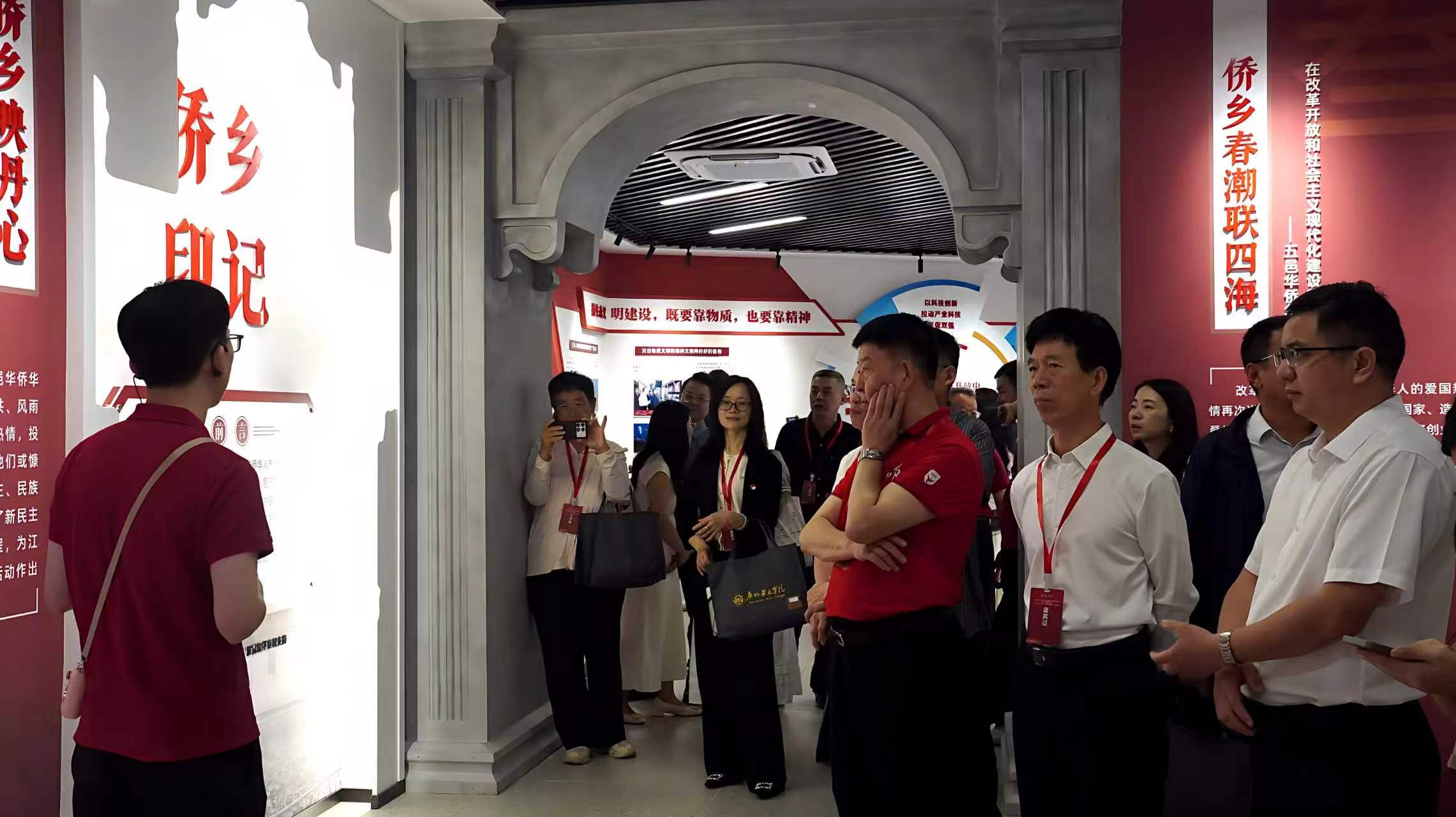 活动现场举行了庄重的“红色印记展馆”揭牌仪式。该展馆是广州华立学院践行“为党育人、为国育才”使命的重要成果:馆外长廊镌刻党的一大至八大红色地标;序厅彰显办学初心与信仰底色;百年印记厅以四大篇章展现党的百年奋斗历程,配套精神谱系互动屏与入党宣誓区;南粤印记厅讲述广东红色革命史与新时代发展成就;侨乡印记厅展现五邑华侨爱国爱乡故事;华立印记厅展示学校党建引领、思政育人与办学成果。展馆集党史教育、思政教学、文化传承、实践育人于一体,通过沉浸式、互动式展陈,打造可看可感可学的“思政大课堂”。
