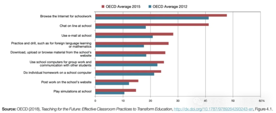 充分利用ICT提供的独特机遇是关键。然而,PISA 2015数据显示,当今课堂上技术的最常见用途往往是模拟可以在没有数字设备的情况下进行的更传统活动(例如为功课浏览互联网、在线聊天),而诸如一周内在学校进行计算机模拟的活动被平均只有15%的学生报告(见图3)。