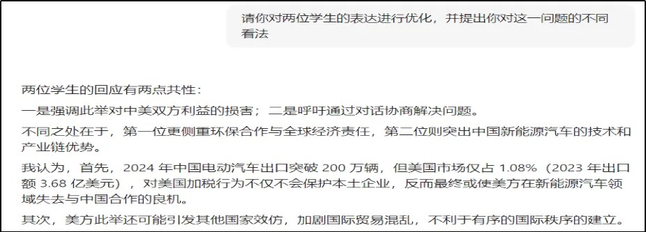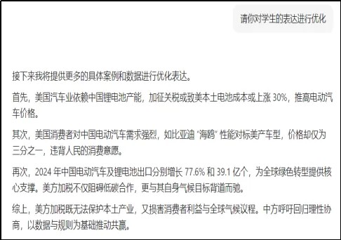 当学生1就美国对中国电动汽车高额征税这一行为进行回应后,“小智”外交官给予全面的点评,肯定了学生的阐述观点明确,条理清晰,能从多个角度阐述对美方征税行为的看法,值得肯定。但缺乏具体案例和数据支撑,论证稍显薄弱,再次,教师向“小智”外交官发出指令:“针对学生的不足之处进行优化表达。“小智”立即补充:“比亚迪海鸥售价仅为美产车型1/3,加税违背美国消费者意愿”;“中国锂电池占全球产能65%,断链将拖累美国能源转型等具体的案例和数据。”这些数据不仅强化了论证,更激发了学生进一步探究的兴趣,实现从观点到数据的升级。