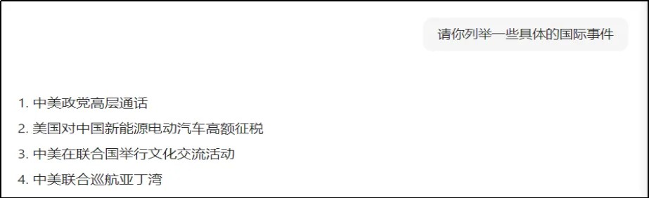 通过向豆包发出指令:“围绕中美国际关系提供2024年至今的四个包含竞争、冲突和合作形式的案例,要求涵盖政治、经济、文化军事领域。”进而豆包便生成了一份清单:(一)中美政党高层通话;(二)美国对中国电动汽车加征100%关税;(三)中美在联合国举办文化交流活动;(四)中美联合巡航亚丁湾。学生结合豆包列举的具体国际事件对国际关系的主体、内容、形式作答,“小智”外交官进行点评,教师总结国际关系的基本知识。