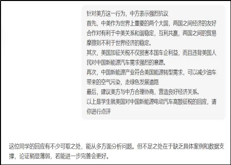 教师设置模拟外交官探究活动,小组讨论:假如你是我国的商务部发言人,请就美国对华电动汽车高额征税的行为进行回应?学生回应后,“小智”外交官对学生的回应进行点评,肯定学生回应的可取之处,指出不足,并对表达进行优化。以下是具体的实施案例: